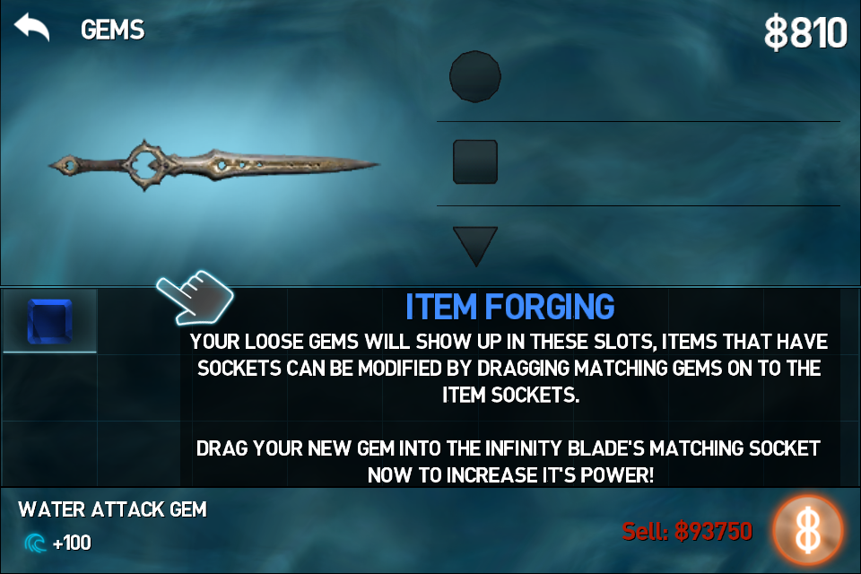 The gameplay has expanded in IB2: You now get to forge weapons with gems, with weapons having different kinds of sockets. For example, you might be able to purchase a blade or helmet with 2 sockets, one for circular gems and one for triangular gems. This gives the player a bit of customization on what kind of weapon they want to use. Socketing gems can also give you resistance or bonus damage for an element, useful since the higher level enemies have resistances and bonuses as well to their gear.